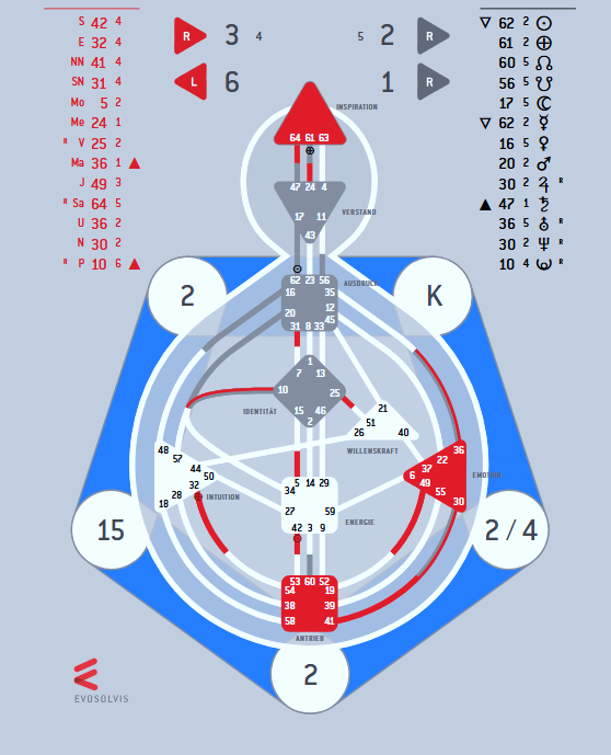 aus der Symbiose und der definierten Berechnung entsteht ein Human Design Chart, das die individuelle Funktionsweise eines Menschen sichtbar macht und das sehr deutlich!